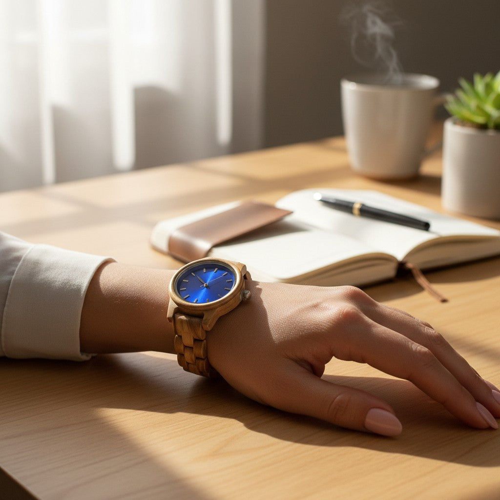 • This Tree Ticker women's wooden watch is hand crafted from smooth olive and zebrawood and features a full wooden band. The hypoallergenic wood is great for sensitive skin, and extremely light weight to wear. Fitted with a high quality Japanese miyota movement.